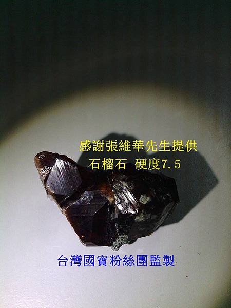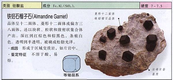 石榴石硬度大致為7,鎂鋁榴石、鐵鋁榴石硬度較硬,接近7.5台灣所發現的石榴石礦物,主要為鎂鋁榴石、鐵鋁榴石及錳鋁榴石,呈現暗紅色與棕紅色,大多分布在花蓮秀林,萬榮,豐田,瑞穗,玉里及宜蘭烏石鼻等變質岩地區.台灣石榴子石礦床至今仍未大規模開採,僅在業者申請探採蛇文石,滑石或水晶等礦種時,才偶有伴隨出露;至於是否具有開發潛力與發展空間,則仍待進一步的調查.